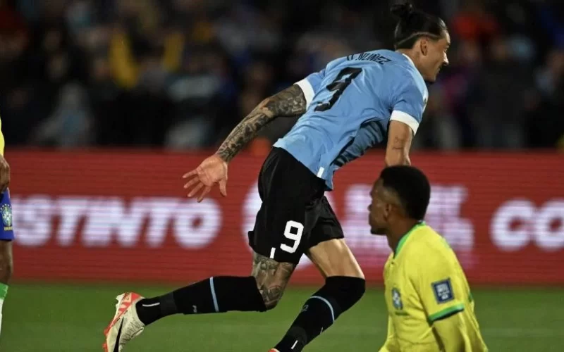 No ritmo travado, a Celeste aproveitou falha defensiva para ampliar o marcador. Darwin Nuñez, marcado por Gabriel Magalhães e Casemiro, levou a melhor dos dois e rolou para De La Cruz só cutucar para o fundo do gol.