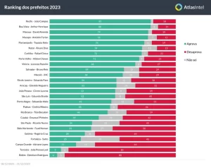 Na sequência, a pesquisa da Atlasintel aponta entre os mais aprovados Arthur Henrique (Boa Vista), David Almeida (Manaus) e Antônio Furlan (Macapá). Os chefes de executivo municipal com os maiores índices de rejeição são Edmilson Rodrigues (Belém), João Pessoa Leal (Teresina), e Adriane Lopes (Campo Grande). O ranking completo segue na foto abaixo.