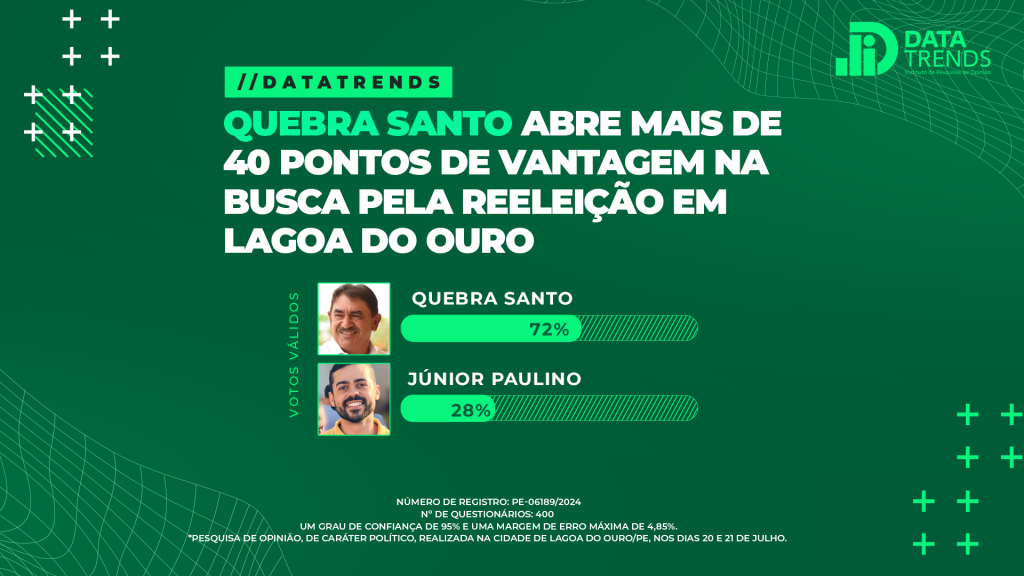 Pesquisa do Instituto DataTrends divulgada nesta sexta-feira (26) mostra o prefeito Edson Quebra Santo liderando a disputa pela reeleição com mais de 40 pontos de frente em Lagoa do Ouro, no Agreste. Na pesquisa espontânea, Quebra Santo aparece com 51% e Júnior Paulino com 19%. Não sabe ou não respondeu são 30%. Na estimulada, Quebra Santo sobe para 59%, contra 22% de Júnior Paulino. Brancos e nulos somam 4% e não sabe ou não respondeu 15%. Em votos válidos: Quebra Santo 72% e Júnior Paulino 28%. Potencial de voto de Quebra Santo – Votaria com certeza (57%), poderia votar (14%), Ler mais…