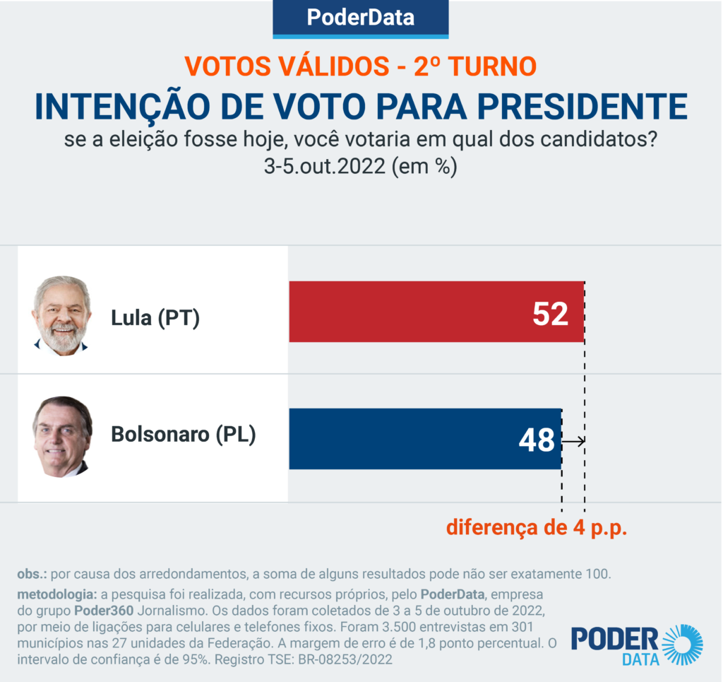 Pesquisa PoderData realizada de 3 a 5 de outubro de 2022 mostra Luiz Inácio Lula da Silva (PT) com 52% das intenções de voto contra 48% de Jair Bolsonaro (PL) no 2º turno das eleições. O placar é referente aos votos válidos – os atribuídos a algum dos candidatos, excluindo-se brancos e nulos. A diferença numérica é a menor já captada pelo PoderData em um confronto direto entre os 2 candidatos. A distância indica vantagem mínima do petista – não há empate técnico, já que o levantamento com 3.500 entrevistas tem 1,8 ponto percentual de margem de erro. Essa é a 1ª Ler mais…
