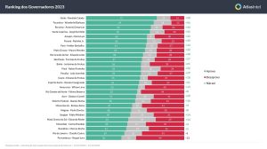 O ranking é liderado pelo governador de Goiás, Ronaldo Caiado, com 72% de aprovação. Ele é seguido por Wanderdei Barbosa, governador de Tocantins, com 69% de aprovação.