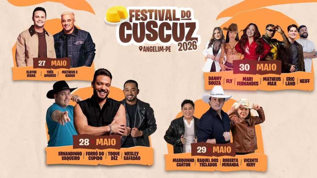 O município de Angelim já vive a expectativa para mais uma edição do tradicional Festival do Cuscuz, que será realizado entre os dias 27 e 30 de maio. A principal atração do evento será o cantor Wesley Safadão.